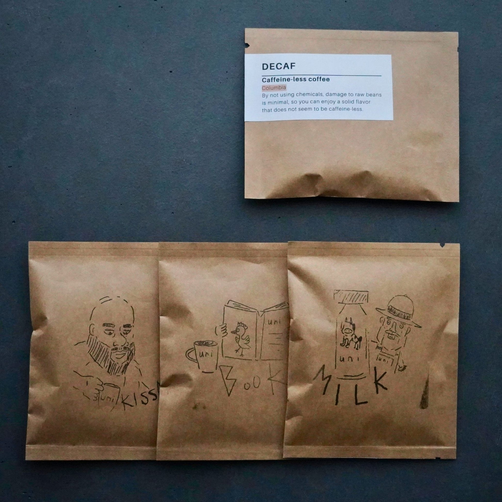 - デカフェ コロンビア(Decaf) 化学薬品を一切使わない「スイスウォーター製法」でカフェインを99.9%除去。デカフェとは思えない香ばしいコクがあり、夜のリラックスタイムに最適です。